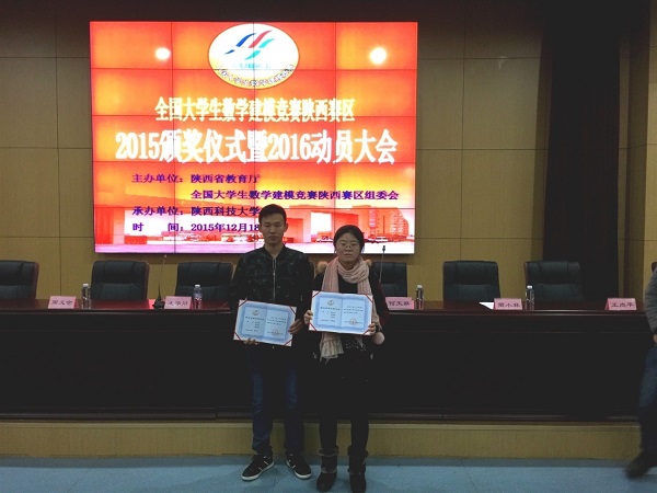 2015年12月18日下午,“高教社杯”全国大学生数学建模竞赛颁奖仪式在陕西科技大学举行,我校理学院应用数学系建模指导教师王婷婷带领两名获全国奖的学生代表出席了颁奖大会。