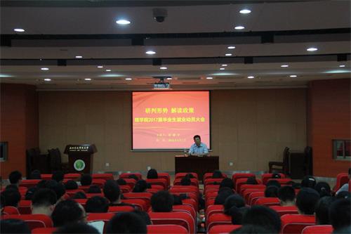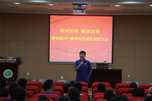 为了帮助毕业生认清就业形势,了解就业相关政策,助力毕业生合理定位,9月1日晚,理学院在北绣山活动中心北报告厅召开2017届毕业生就业动员大会,特邀就业中心主任胥耀平教授为大家解读就业形势和相关政策,会议由理学院党委书记王吉成主持,学院就业工作辅导员、毕业生班主任及全体本科毕业生参加会议。
